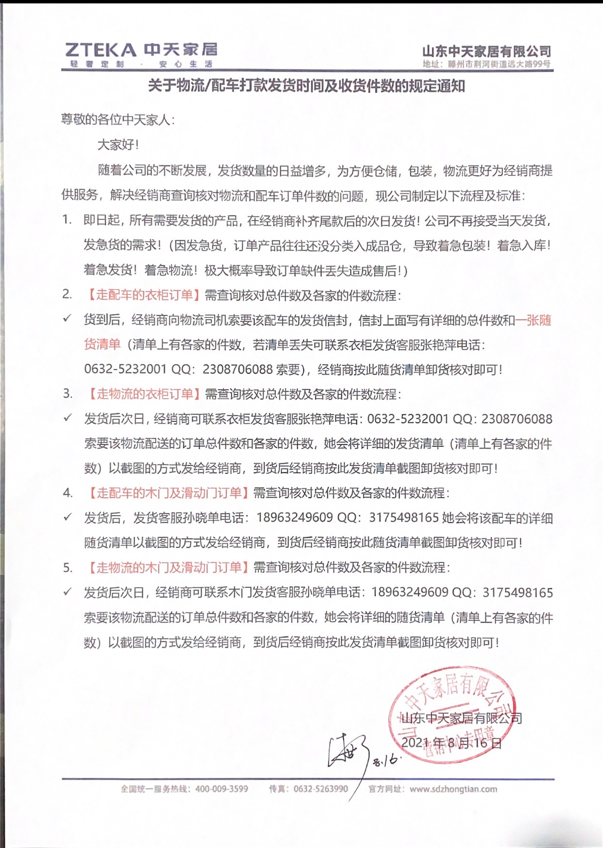 《关于物流/配车打款发货时间及收货件数的规定通知》