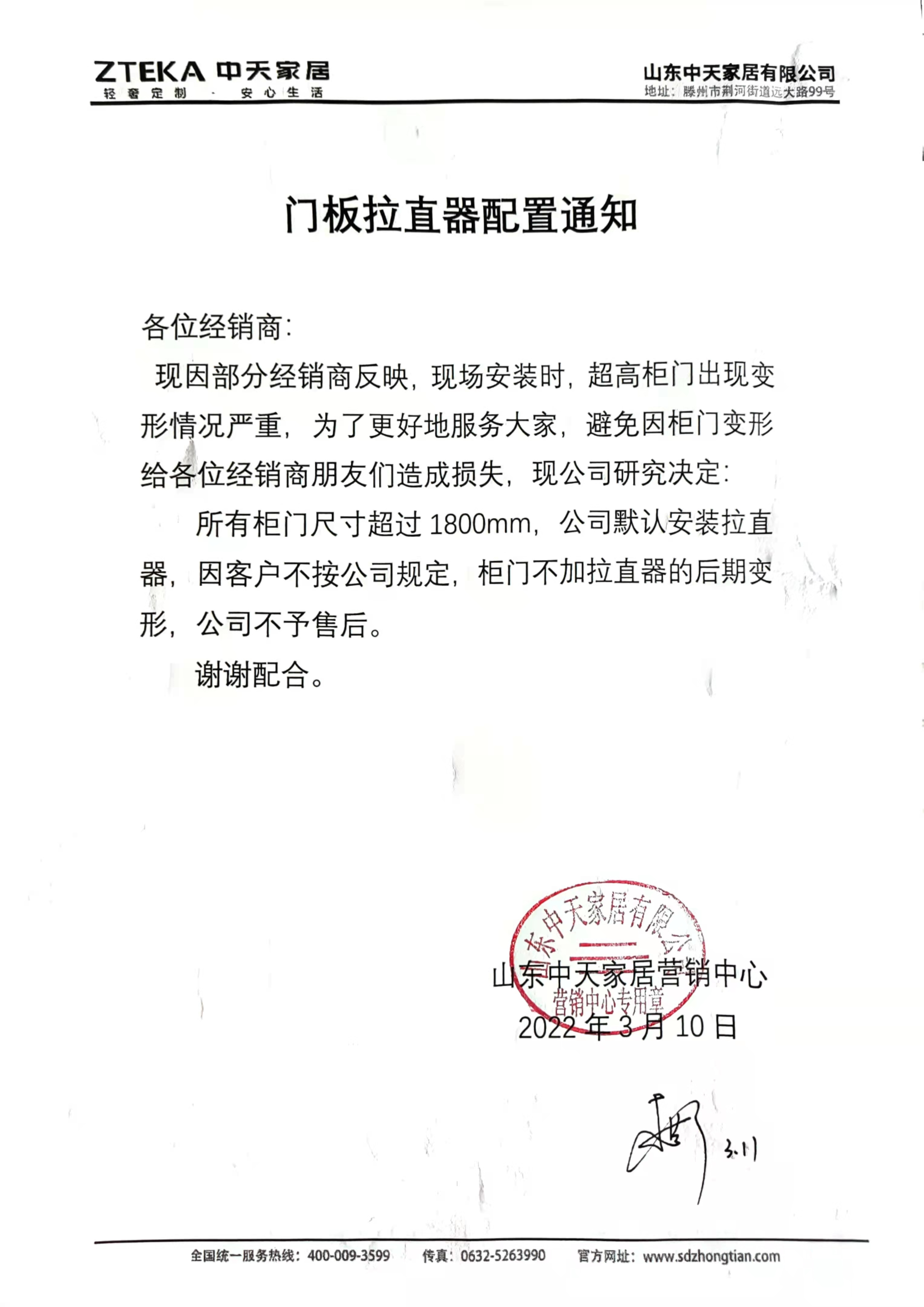【中天家居】通知关于门板拉直器的配置通知已公布 详情如下图,请大家仔细查阅!