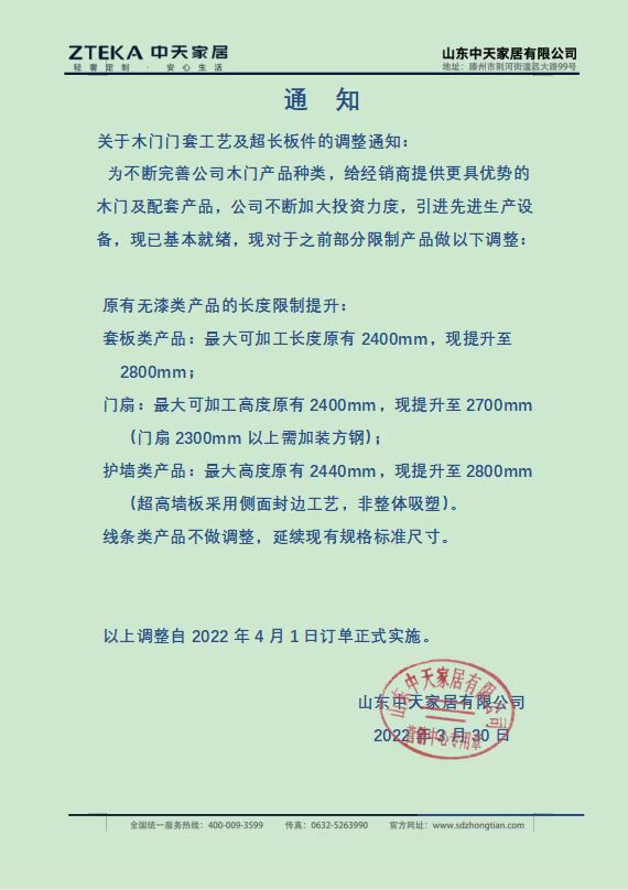 关于木门门套工艺及超长板件的调整通知