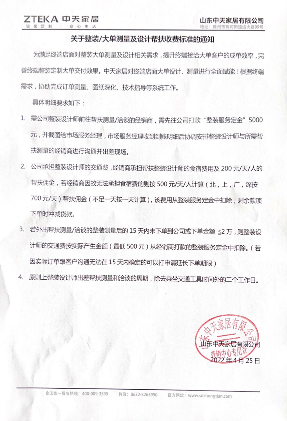 关于整装/大单测量及设计帮扶收费标准通知