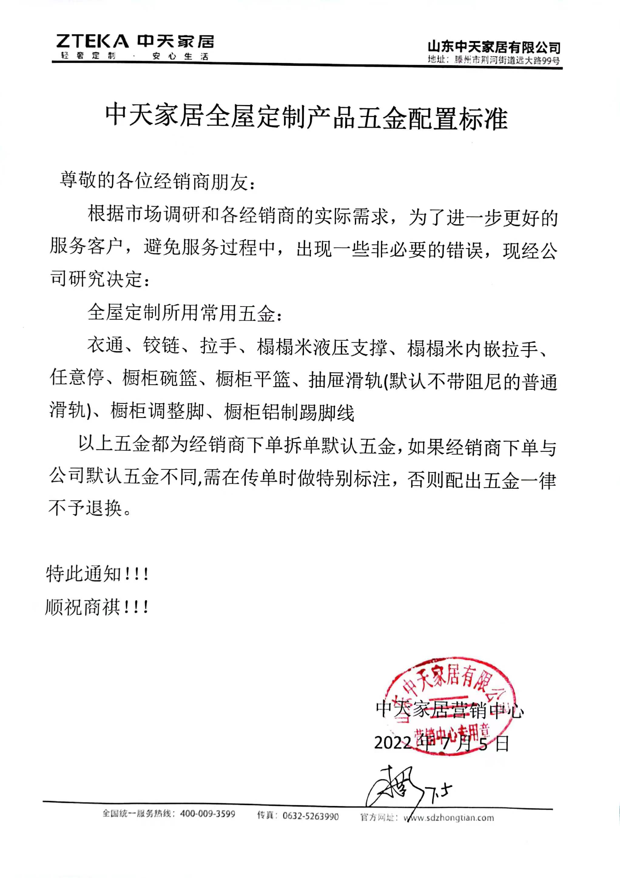 中天家居全屋定制产品五金配置标准